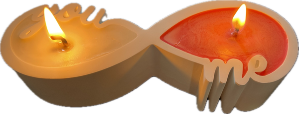 Bougie coulée dans un élegant bougeoir en plâtre, fait à la main, rappellant le signe de l'infini "You & Me".
